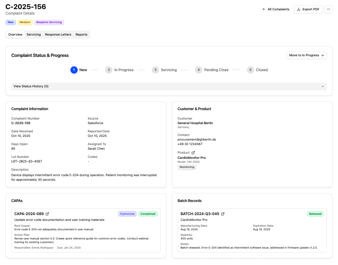 Capture complaints from existing systems, assess risk and reportability, and manage investigations in one place as data accumulates over time.